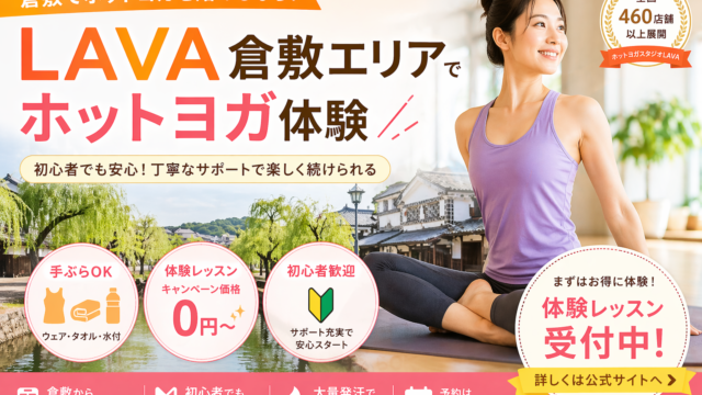 倉敷でホットヨガを探している方へ。LAVAの体験レッスンを初心者向けに解説。通える店舗・料金・口コミ・アクセスの注意点までまとめました。岡山エリアで失敗しない選び方も紹介。